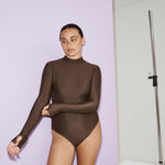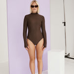 Turtleneck Surfsuit in Coffee with contrasting Lavender back zipper.