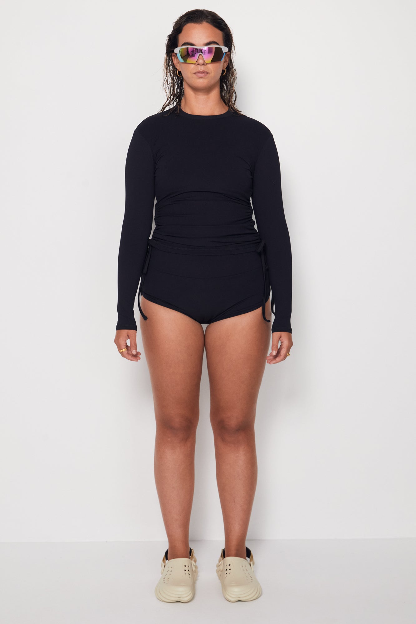 Our design challenge has never deviated since the first surf leggings we designed way back in 2012: how to create stylish and fashion-forward sun protection that actually functions well in punchy surf and supports our own expression of personal style in the lineup. We're expanding our rashguard offering with this new style: ruching at the sides for you to style up or down, with your preferred surf bottom of choice, and a well-covered neckline. Boom.