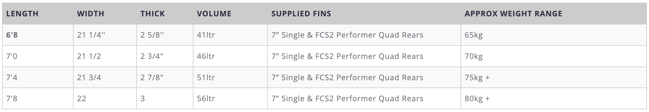 6'8 length | 21 1/4" width | 2 5/8'' thick | 41L volume