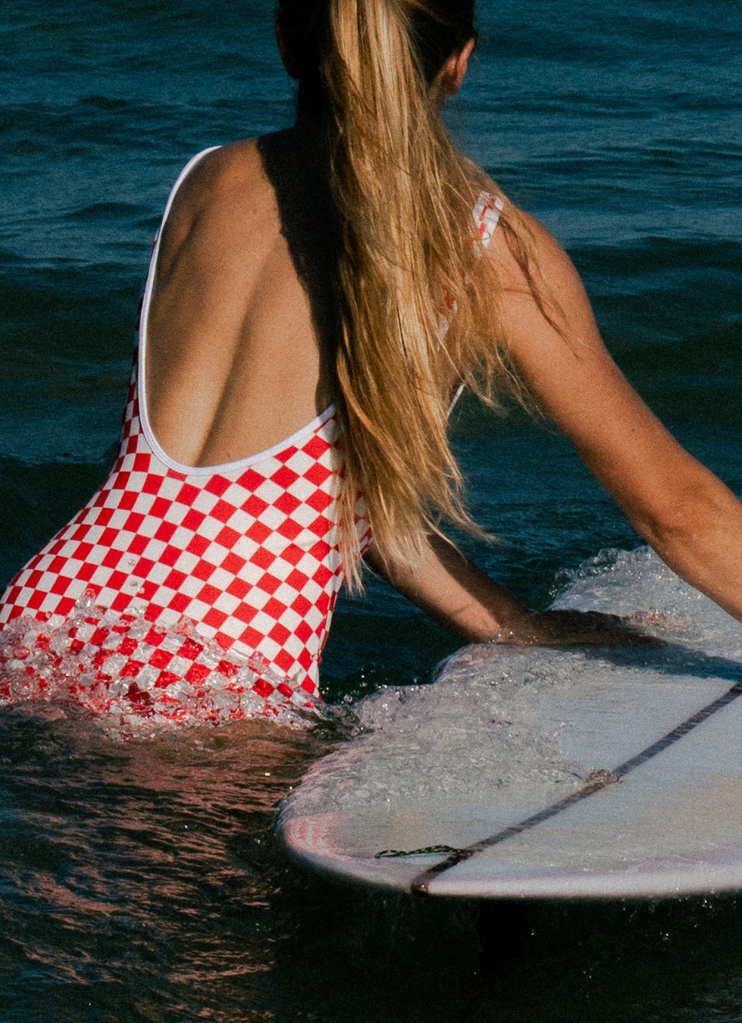 The result is bold, graphic, and playful. Designed to mix and match with our new Chilli Checkers print, Oceania brings a hit of colour and confidence to pieces made for salt water, sun, and long days outside. It’s fun without being loud, considered without being precious - swimwear that feels as good paddling out as it does stretched out on the beach after a dip.