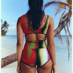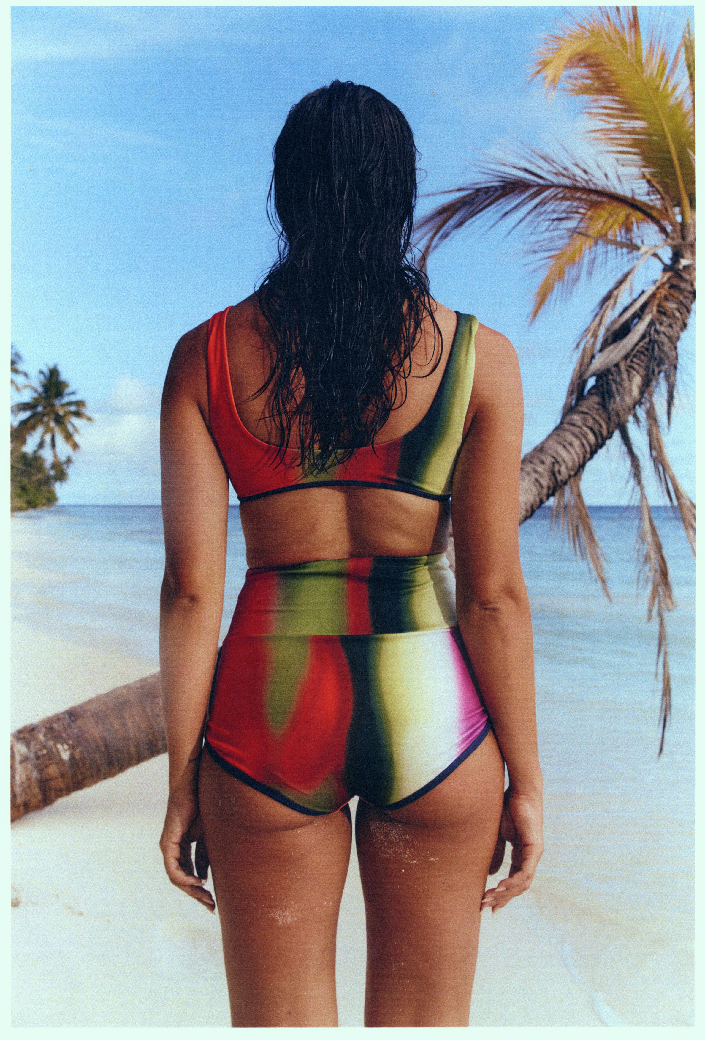 Ombré print is an all-over yardage print - not a placement print. This means each piece will be unique in it's colourways and no two pieces will be exactly the same. Printed on a recycled polyester that is opaque and won't become transparent when wet.